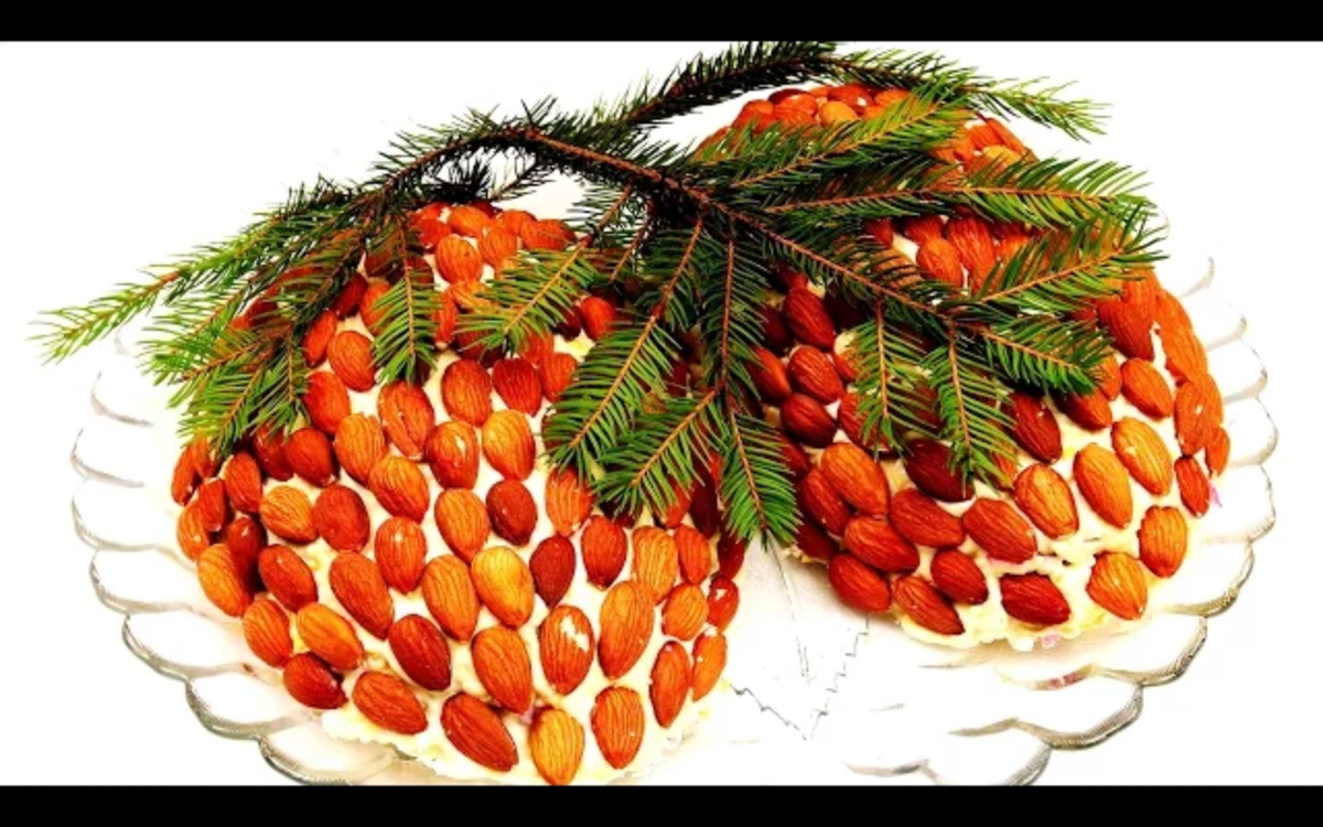 Добрый день мои подписчики и любители оригинальных блюд! Сегодня вашему вниманию представляю салат "Сосновые шишки", который понравится любителям миндаля и просто впечатлит гостей не обычным вкусом и подачей: