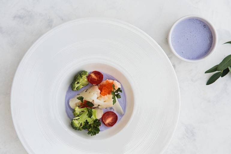 Хотите удивить домочадцев или гостей? Тогда приготовьте этот суп необычного цвета и дайте им возможность угадать какие ингредиенты вошли в состав. Предупреждаем, ответы могут всех удивить и развеселить! Ингредиенты (для 1 порции 290 гр.): Фреш из краснокачанной капусты – 50 мл. Кокосовое молоко – 165 мл. Вода – 45 мл. Масло оливковое – 1 ч. л. Картофель – 1 шт. Соль морская – 1 щепотка. Цветная капуста – 50 гр. Брокколи – 20 гр. Помидоры Черри – 2-3 шт. Икра красная (веганская) – 15 гр. Листья петрушки и ростки редиса – по 1 веточке. Приготовление: Для начала нужно приготовить бульон. Для этого отправляем в блендер – капустный фреш, кокосовое молоко, воду, оливковое масло, картофель, морскую соль. Все это взбиваем до однородной консистенции. Затем бульон нужно подогреть на плите, не доводя до сильного кипения. После подогрева еще раз прокручиваем в блендере. В глубокую тарелку выкладываем отварную цветную капусту, свежие соцветия брокколи, томаты черри. Сверху аккуратно наливаем бу