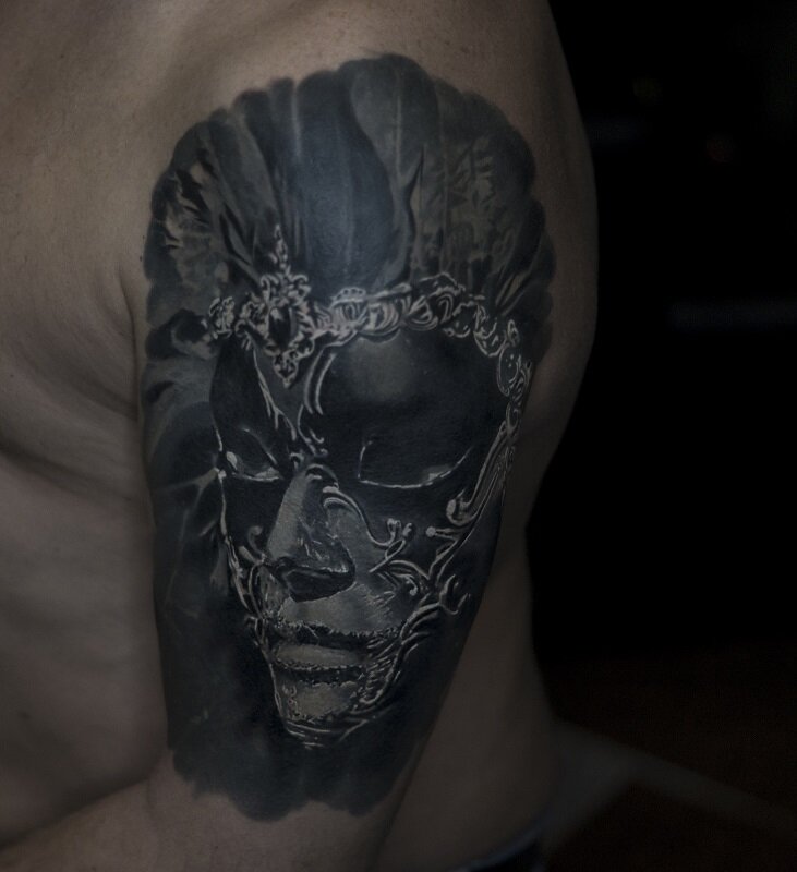 Изображение в виде маски на теле человека, показывает, что он двуличный и не искренняя личность. Его характер, разделён на две части: добро и зло, веселье и печаль, лживость и правдивость, а маска скрывает настоящую сущность, открывая только те качества, которые нужны для общения с другими людьми. Такой человек, очень загадочный для окружающих и все стремятся его разгадать. При выборе татуировки с этим изображением нужно убедиться, что её значение полностью совпадает с вашими качествами. Необходимо быть артистичным и таинственным человеком со скрытным и переменчивым характером. Для того, кто присматривается к такому рисунку, будет интересно узнать что означает татуировка маска. Маски, эскизы которых существуют в мире тату делятся на такие виды: театральная, венецианская, голливудская, маска Ханья. Ханья японская маска символизирует печальную и мстительную личность. В японской мифологии, изображает девушку, брошенную любимым человеком. Она желала отомстить сопернице, стала оде