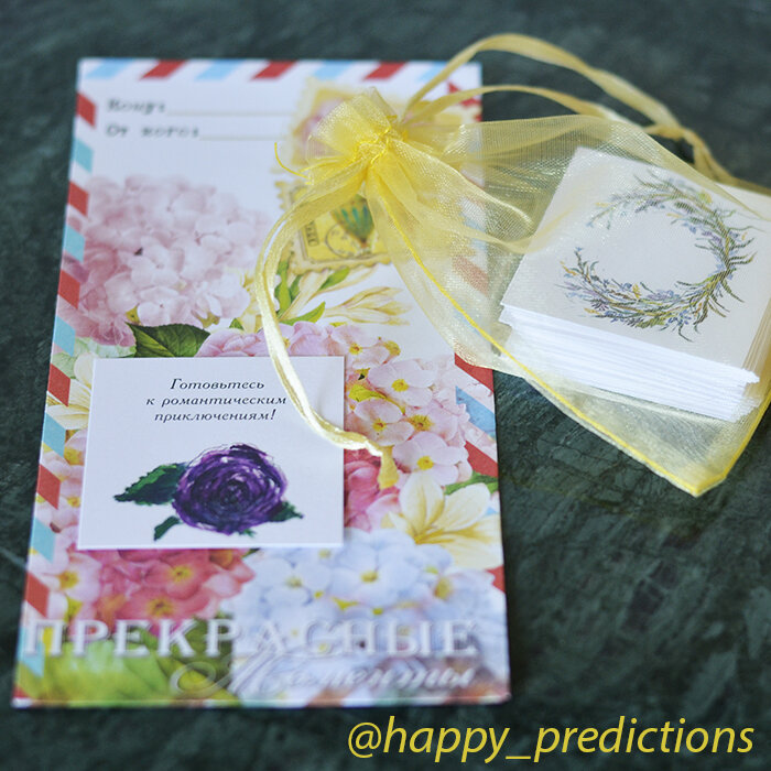 Совсем скоро начинается вереница Новогодних поздравления: партнеры, коллеги и просто знакомые. Дарятся календари, ежедневники, конфеты и бутылки. Основной набор не меняется с годами. Но самое главное, такой подарок не запоминается и никак не выделяет дарителя! Хотите удивить и запомниться? Подарите набор «Счастливые предсказания»! Это 32 карточки с разными добрыми и приятными предсказаниями! По одной карточке на каждый день месяца + одна для своего личного предсказания или пожелания. Карточки размером 5*5 см, на плотной, очень красивой блестящей бумаге, с авторскими рисунками упакованы в подарочные мешочки из органзы и упаковочный пакетик. Подарок полностью готов! Рецепт использования прост: утром за чашкой ароматного чая или бодрящего кофе надо подумать о предстоящем дне или какой-то задаче и вытянуть 1 карточку из колоды. Это и есть ваше предсказание. Как это работает? Никакой мистики! Я подслушала это у Радислава Гандапаса: 93% человеческого внимания обращено на поиск угроз и тольк