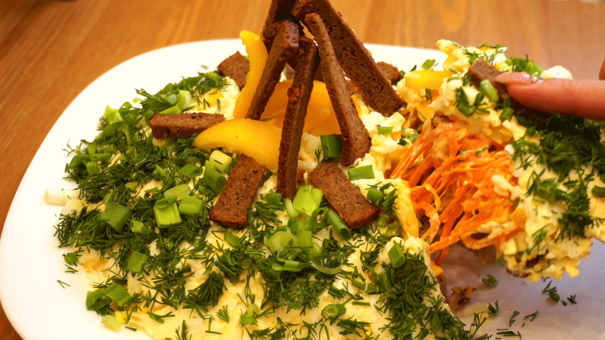 Для заправки смешиваю майонез и сметану. Курицу нарезаю кубиками, смешиваю с заправкой и выкладываю на тарелку первым слоем. Далее друг за другом идут остальные ингредиенты: гренки, лук, морковь, и пр. Последним слоем - натертые яйца. В конце декорирую салат, как в моем видео. Приятного аппетита от Оливье ТВ! :)