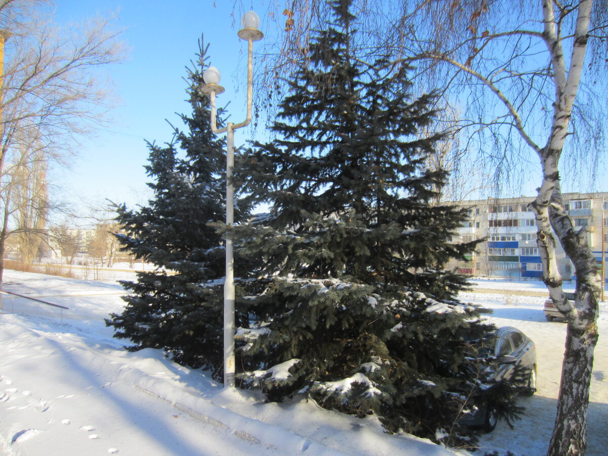 А эти елочки я снимала в субботу 2 декабря. Иней посеребрил каждую веточку. И ветер был очень сильный. Елочки разные у нас в городе. И их лапки все в инее. Смотрятся на снегу очень красиво.