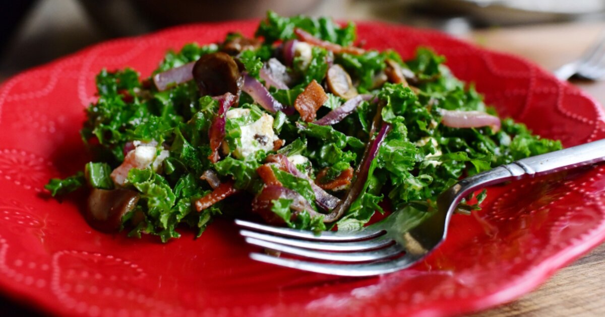 Этот салат подойдет в качестве паузы в дни Рождественского обжорства, особенно когда после девятисотого рулета с корицей вы решаете, что вам просто необходимо что-то зеленое и хрустящее, прежде чем вы окончательно сойдете с ума. Итак, прежде чем вы продолжите есть свой 901 рулет с корицей.. Сначала нарежьте несколько кусочков бекона на кусочки… Обжарьте до хрустящей корочки... Положите его на бумажное полотенце для того, чтобы оно впитало излишки масла... Добавьте на сковородку немного масла. Уменьшите температуру и когда масло растает, поджарьте на нем порезанный на кусочки красный лук... Поджаривайте его на медленном огне, слегка помешивая, пока он не станет мягким и закарамелизируется. Это займет 10-15 минут, так что не торопитесь! Положите поджаренный лук на тарелку.... Затем бросьте на сковородку нарезанные грибы и потушите их! Затем налейте в них чуточку вина...белого или красного, как вашей душе угодно... Добавьте щепотку соли и перца... Готовьте пока грибы не станут мягкими...