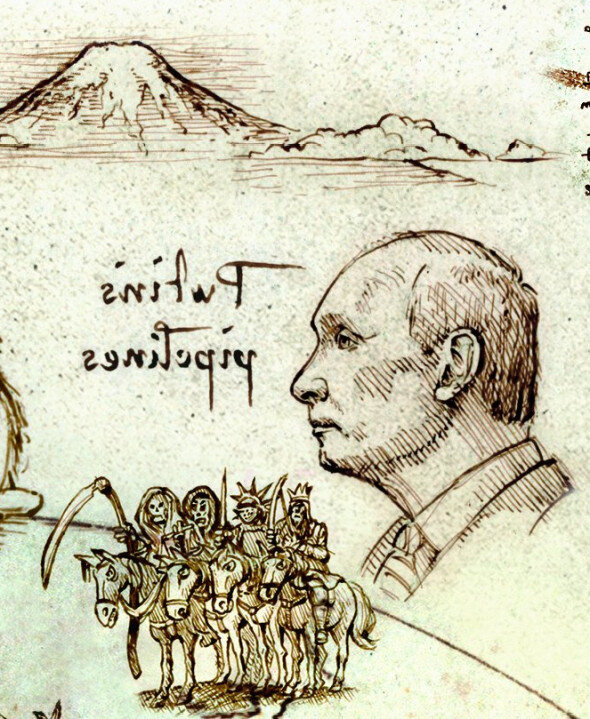 Все очень просто: мы видим четырех всадников Апокалипсиса, как четыре национальные катастрофы, непосредственно под носом у Путина. Именно под носом. (А он как бы их не видит (?)) Так вот, согласно этому прогнозу, в 2019 году Россию одолеют Мор (первый всадник), война (второй), Голод и Смерть.