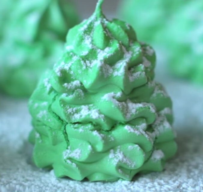 Новогодняя идея из традиционного безе выполнить симпатичные фигурки ёлочек и шапочек Санта Клаусов. РУКОВОДСТВО ПО ПОДГОТОВКЕ · время подготовки - 20 минут; · количество порций - 24 шт.; · калорийность – 54 ккал на 1 порцию. ИНГРЕДИЕНТЫ 150 гр. яичного белка; щепотка соли; 150 гр. сахарного песка; 150 гр. сахарной пудры; ½ чайной ложки пищевого красителя зелёного цвета; ½ чайной ложки пищевого красителя красного цвета. ПРИГОТОВЛЕНИЕ Предварительно нагреть духовку до температуры 90 гр. С. Взбить 150 гр. яичных белков с щепоткой соли в миксере до воздушного объёмного состояния. Добавить 150 гр. сахара-песка небольшими партиями. Взбить еще 8-10 минут, пока сахар полностью не растворится и не образуются жесткие блестящие пики. Затем добавить 150 гр. сахарной пудры и взбить еще 10 секунд. Приготовленную массу разделить на 3 равные части. Одну часть белковой массы оставить белой. Во вторую часть положить пол чайной ложки зелёного пищевого красителя и перемешать до одноро
