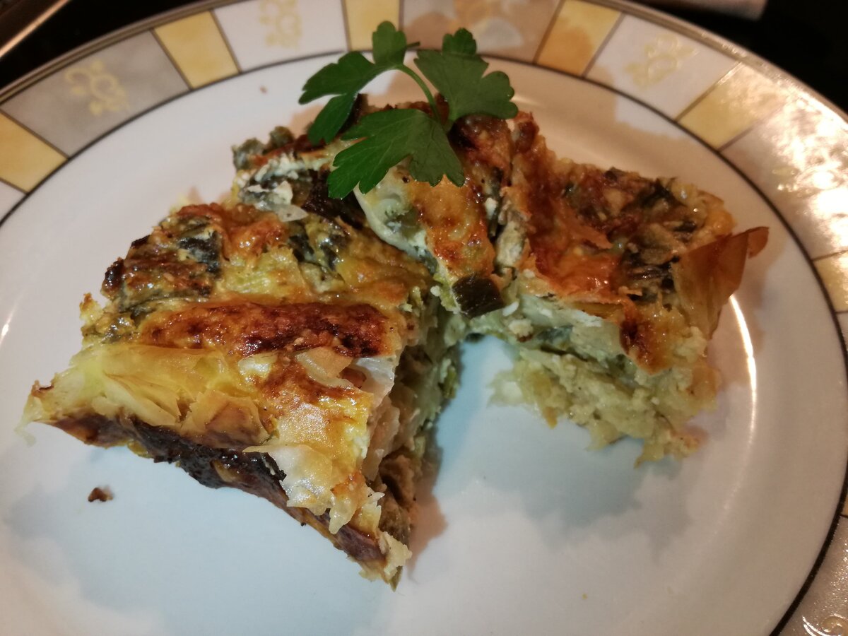 В Греческой кухне большое значение уделяется выпечке, существует множество рецептов пирогов и пирожков с разнообразными начинками. Некоторые из них могут быть в новинку для русского ценителя гастрономических изысков, поэтому очень рекомендую попробовать этот рецепт! Прасопита-греческий луковый пориг из лука пореяи сыра-очень вкусный, сытный, можно подавать как в горячем виде так и в холодном. Это один из коронных рецептов моего мужа, поэтому я снова исполняю роль репортера)) Итак, поехали.. Нам понадобится: 2 стебля лука порея 1 стебель зеленого лука 500 г тонкого теста 1\2 луковицы 200 г твердого сыра 300 г сыра фета немного белого вина 4 яйца 300 мл молока перец Способ приготовления: Лук порей хорошенько промываем и просушиваем В кастрюле с толстым дном обжариваем мелко нарезанный репчатый лук мелко рубим лук порей и зеленый лук добавляем в кастрюлю, обжариваем минут 5 и добавляем около 80 мл вина, тушим до выпаривания затем заливаем 100 мл молока в большую миску натираем твердый сыр
