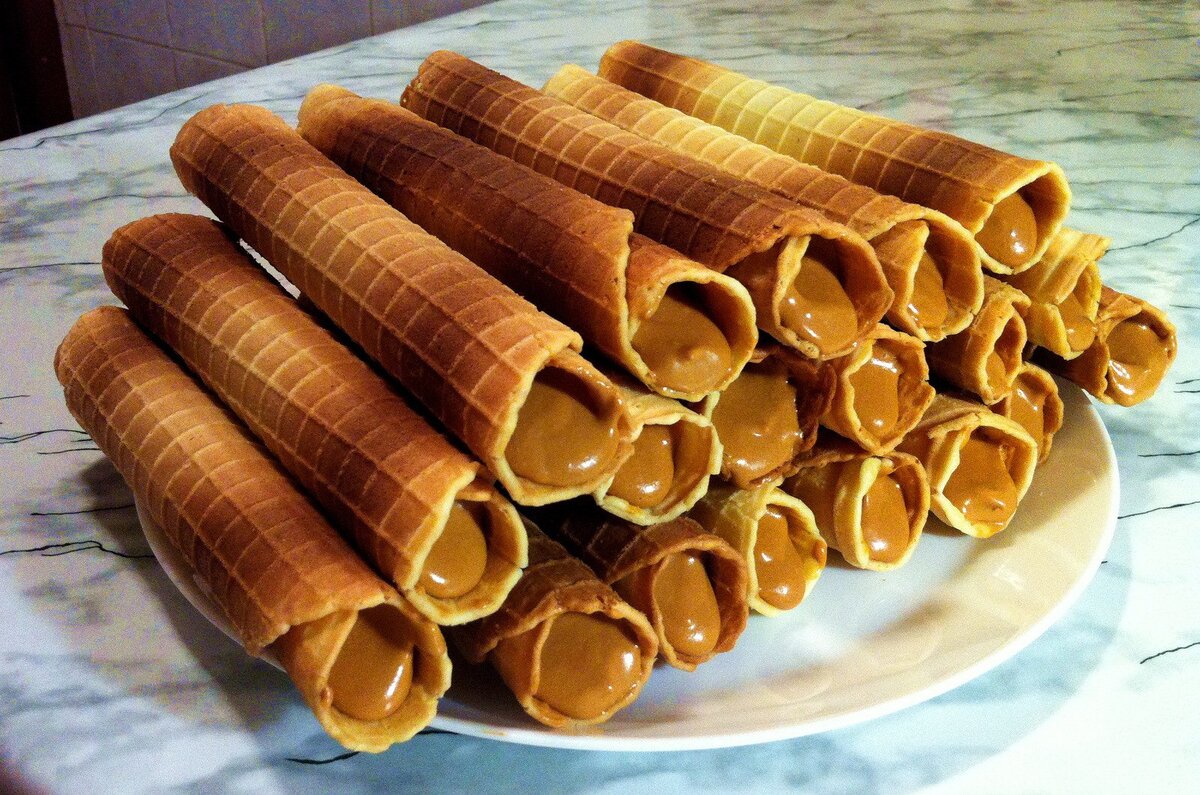 - Открываем вафельницу и аккуратно выкладываем на вафлю столовую ложку начинки и сворачиваем всю композицию в трубочку при помощи ножа.