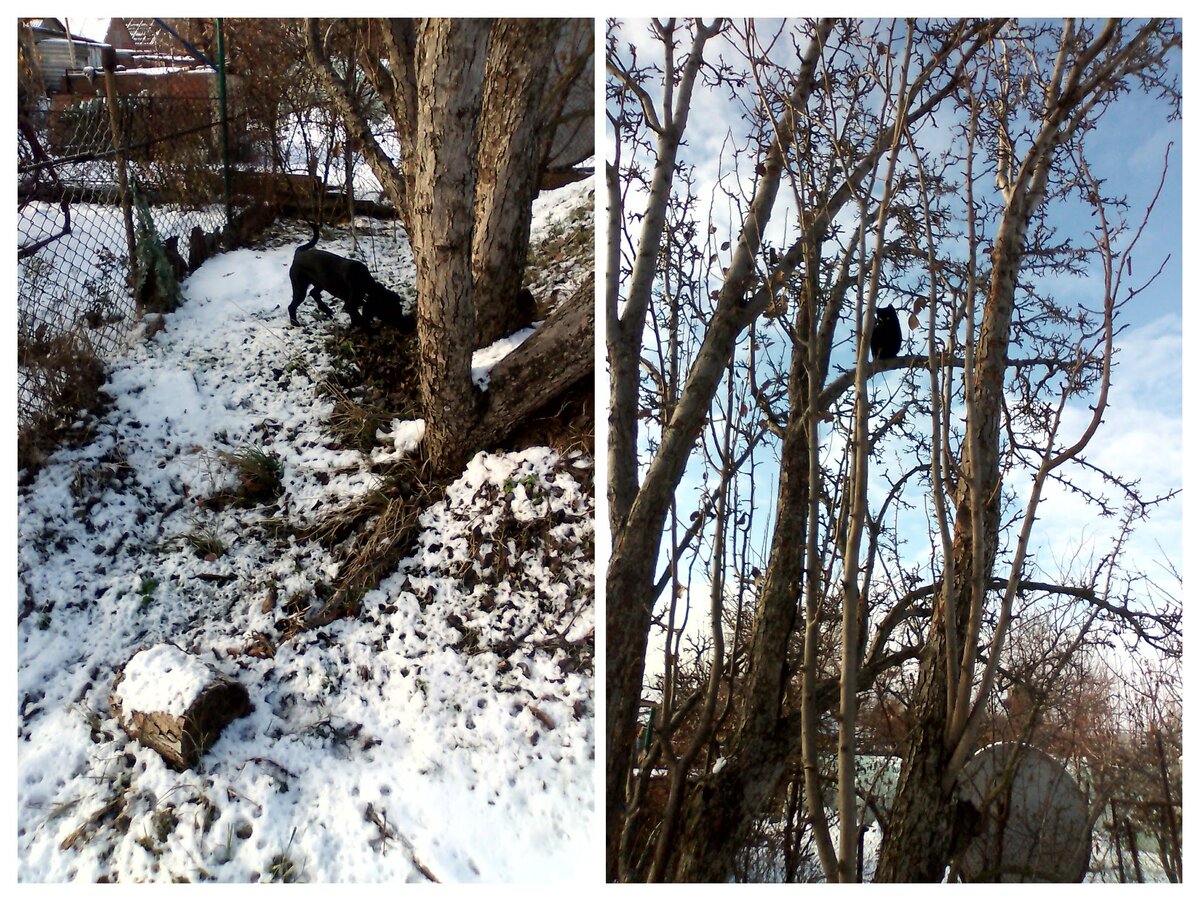 Стич, решил снова отличиться, и на этот раз, он выбрал новое развлечение, а именно - гонки за кошкой по пересечённой местности. Выйдя в 7 утра на улицу, пожевав остатки снега, и выполнив обязательную пробежку, Стич в раздумьях возвращался домой, как вдруг с терассы начала спускаться Тенька. Ни секунды не раздумывая, пёс с кромким лаем побежал к ничего не позревавшей до этого момента кошки, чем естественно напугал беднягу. По двору начался спринт: впереди, перепрыгивая встречные припятствия неслась на всех парах Тенька, а за ней вприпыжку сообщая всей округе Стич. Сделав несколько кругов по двору, Тенечка применила хитрый манёвр, и развернувшись на 180 градусов перемахнула через летящего на ушах счастья пса и оттолкнувшись от небольшого холмика взлетела на старенькую грушу. Попрыгав вокруг дерева, Стич недовольно высказывался в адрес кошки о её нечесного и абсолютно неспортивного поведения. Но миниатюрная красотка, полностью игнорируя нарушителя её кошачьего спокойствия, удобненько рас