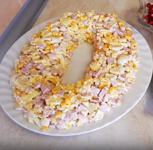 Скажу честно, этот салат я готовлю каждый Новый год! Теперь у меня свои традиции, от которых трудно отойти. Салатные ингредиенты Совет. Для заправки я использую домашний майонез. Салат получается более насыщенный в связке с данными продуктами и продуктами для украшения салата. Ингредиенты для украшения салата Время приготовления: 15 минут. Приготовление Чеснок выдавить чеснокодавкой. Порезать ветчину кубиками. натереть сыр на крупной терке. Маринованные грибы порезать на 4 части(каждый грибочек). И выкладываем все продукты в одну тару, заправляем майонезом и перемешиваем. Совет. Если вы делаете домашний майонез по рецепту, то солить и перчить салат не стоит. Теперь переходим к самому главному-праздничная подача салата. Если у вас имеется овальное блюдо, то оно идеально подойдет. Выкладываем равномерно весь салат в форме овала, оставляя в середине пустое место. Отрываем веточки укропа и покрываем салат в произвольной форме. Зёрна граната раскладываем некими "гирляндами" по салату(ф