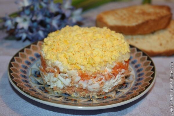 Салат подойдет абсолютно на любой праздничный стол. Его особенность в легкости приготовления и в присутствии очень маленьких затрат средств и времени. Ингредиенты Приготовление Отвариваем картофель в мундире и морковь. Варить 35-40 минут. Остужаем овощи и очищаем от кожуры. Трем картофель и морковь на мелкой тёрке. Лук мелко шинкуем. Яичные желтки отделяем от белка и мелко растираем и желтки и белки. Вскрываем банку с рыбой, сливаем воду и содержимое банки превращаем в пюре. Теперь выкладываем все ингредиенты слоями. На каждый слой делаем тонкую майонезную сетку. Выкладываем в таком порядке: рыба – белки – морковка – лук – картошка – желтки.