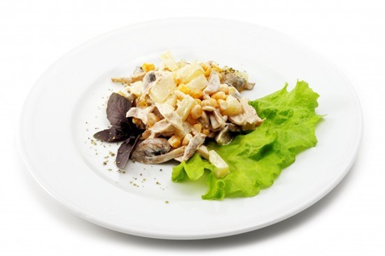 2. Салатник лучше взять прямоугольной формы, чтобы слои получились равными. Выложить ингредиенты слоями, промазывая майонезом, в такой последовательности: курица, ананасы, огурцы. Отставить на 15–20 минут, потом сверху выложить слои яйца и кукурузы.