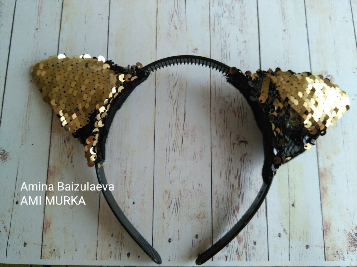 Предлагаю дополнить чешки из предыдущей статьи вот таким ярким ободком, который станет отличным завершением образа на Новый год. Первым делом мы подготовили шаблоны ушек. Обведем их на ткани. Обратную сторону я решила сделать из плотного фетра. Благодаря ему, ушки отлично будут держать форму. Вырезаем все детали. 2 детали из фетра и 2 детали из основной ткани. Сложим их друг на друга лицевой стороной вовнутрь, и прошьем на машинке. Но перед этим убедитесь, что ваши пайетки лежат в одном направлении. Шить удобней тогда, когда сверху будет фетровая заготовка. Отступите от нижнего края 1-1,5 см, для подворота. Низ оставляем не прошитым. Подрежем верхний уголок, и вывернем наружу. Я хорошенько отпарила заготовки. Вырезаю такую же деталь из упаковочной пленки. Помещаю вовнутрь, и подрезаю лишний край. Этот элемент должен быть короче на 1-1,5 см. Теперь остается приклеить ушки к ободку. Ширина нашего ободка 1 см. Я помечаю середину, и отступив одинаковое расстояние от нее приклеиваю сначал