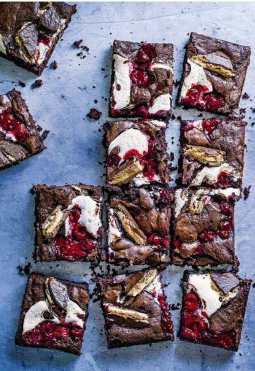 Ингредиенты 100 гр. сливочного масла 200 гр. темного шоколада 4 яйца 250 гр. сахарной пудры 100 гр. пшеничной муки 1 ч. л. разрыхлителя 30 гр. какао-порошка 150 гр. малины (можно замороженную) 2 ст. л. сахарной пудры 1 пачка маршмеллоу 3 шт. печенья Wagon Wheel Процесс приготовления: 1. Для приготовления начинки смешайте в сотейнике малину (предварительно размороженную) с сахарной пудрой и нагревайте на маленьком огне. Постоянно помешивайте. Разогреваем, до тех пока не получится карамелизованный ягодный джем. После отставьте сотейник остывать. 2. Застелите противень бумагой для выпечки. 3. Растопите масло и шоколад на водяной бане. Остудите до комнатной температуры. 4. Разогрейте духовку до 160 градусов. Взбейте миксером яйца с сахаром, пока масса не посветлеет и не увеличится в объеме вдвое. 5. Введите шоколадную смесь в яичную. Потом добавьте просеянную муку, разрыхлитель, какао-порошок и все тщательно перемешайте. Выложите получившуюся смесь на противень. 6. Разложите на поверхнос