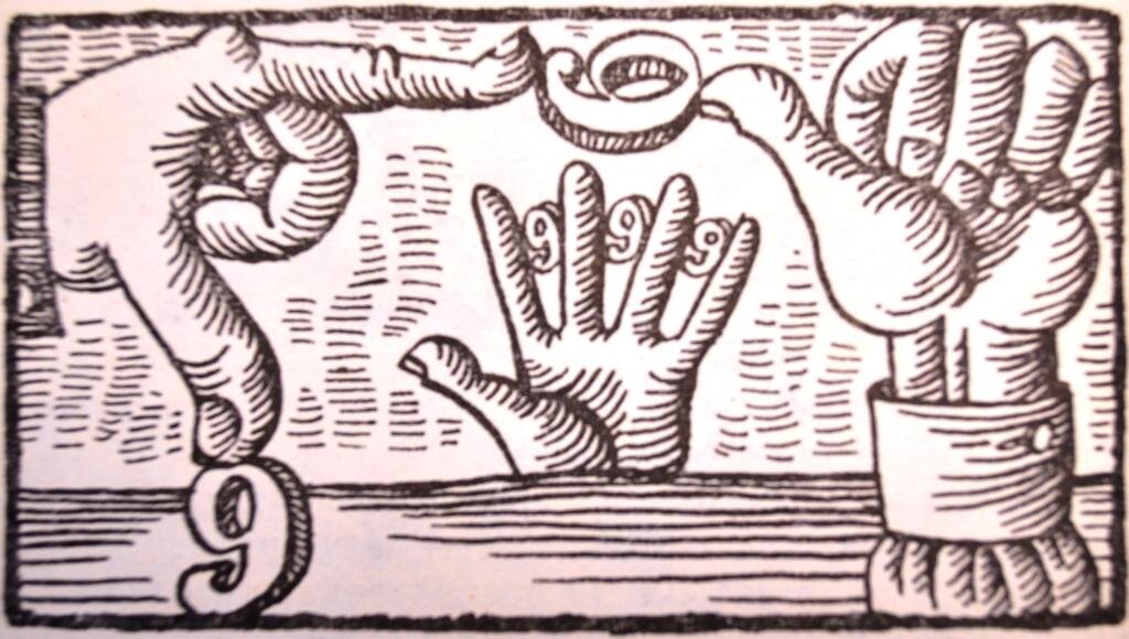 В предыдущей статье "Любопытные свойства чисел. Умножение на пальцах." описывался способ вычислить произведение любых однозначных чисел, больших чем 5 с помощью пальцев рук. А вот это еще один способ помочь памяти с помощью пальцев рук запомнить таблицу умножения на 9. Положив обе руки рядом на стол, по порядку занумеруем пальцы обеих рук следующим образом: Первый палец слева обозначим 1, второй за ним обозначим цифрой 2, затем 3, 4, … до десятого пальца, который означает 10. Если надо умножить на 9 любое из первых девяти чисел, то для этого, не двигая рук со стола, надо приподнять вверх тот палец, номер которого означает число, на которое умножается девять, тогда число пальцев, лежащих налево от поднятого пальца, определяет число десятков, а число пальцев, лежащих справа от поднятого пальца, обозначает число единиц полученного произведения. П р и м е р: Пусть надо найти произведение 4х9 ??? Положив обе руки на сто, приподнимем четвертый палец, считая слева направо. Тогда до поднятог