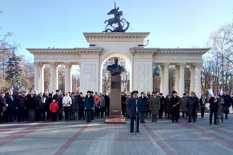 Торжественная церемония возложения, посвященная празднованию Дня Героев Отечества, прошла 9 декабря в сквере им. маршала Г. К. Жукова. Второй год краснодарцы отмечают памятную дату на этом месте. — Подвиги героев всегда будут помнить в нашем городе, именами знаменитых земляков называют улицы — в Краснодаре есть даже целый микрорайон, где улицы носят их имена. Для жителей нашего города патриотизм — не просто слова. Это служение Родине, готовность защищать ее интересы, это духовно-нравственное воспитание молодежи, активная гражданская позиция жителей. Сейчас в Краснодаре живут 12 человек, удостоенных этого высшего звания — один Герой Советского Союза и 11 Героев России. Всех мы знаем поименно. Они — пример для подрастающего поколения горожан, наша гордость и слава. Как и те, кто уже ушел из жизни, и кого нет рядом с нами, — сказал первый заместитель главы Краснодара Сергей Васин. Участники торжественной церемонии собрались в символичном и знаковом для праздника месте — арка «И