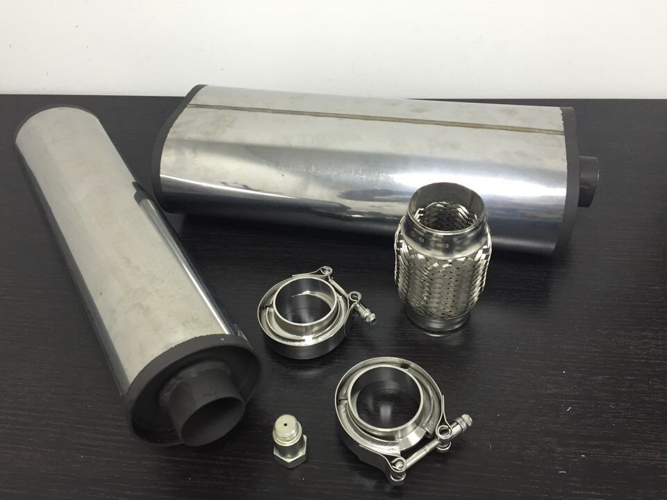 Пока ждём подвеску и спойлер, занялись сборкой в кучу компонентов для выхлопа. Как и писал ранее, будем делать два вида. Один проще и дешевле, второй дороже и сложнее) Недорогой выхлоп будет на одну сторону. Глушитель и резонатор прямоточные, диаметром 51 мм, изготовлены из алюминизированной стали, набиты стекловатой. Визуально похожи на выхлопную систему немецкой фирмы Fox, которая к сожалению покинула Российский рынок в связи с кризисом, поэтому приходится довольствоваться подделками(( единственный плюс это их цена. Глушитель — 2200 рублей, резонатор — 1400 рублей. Собирать будем на v-band для удобства снятия и надежности.