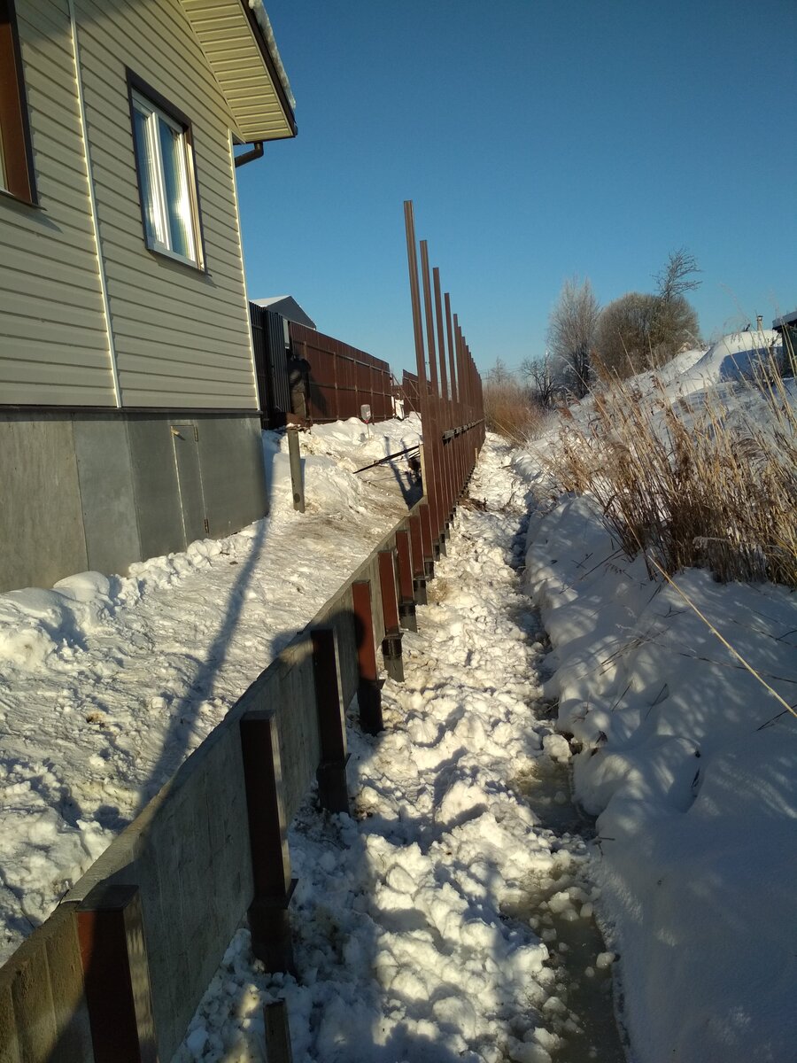 Иногда рельеф на участке требует возведения подпорной стенки. Сегодня мы покажем, как можно укрепить берег или край канавы с помощью саморезных свай. Монтаж на этом объекте производился нами в январе. Это сильно упростило работу: вода в канаве замерзла и получилась довольно приличная дорожка вдоль всей укрепляемой линии. Перепад рельефа до поверхности канавы составляет 1.50 м– 1.70 м на ширине 3 метра. Необходимо соорудить подпорную стенку для последующей подсыпки грунта и переноса существующего забора из профлиста. Основа выполнялась на 108-х сваях. Дополнительная линия поддержки сделана из 76-х свай. Рельеф и существующие строения не позволили использовать трактор, поэтому сваи крутили с помощью переносного гидравлического сваекрута. Сваи по основной линии закручивались с шагом 1 метр на глубину 2.2 - 2.3 метра. После закрутки всех свай, обрезки в горизонт и засыпки ЦПС, к ним приварили оголовки. Они служат не только базой для приварки столбов, но и опорой для первого ряда бетонных б