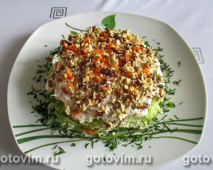 Свежие овощные блюда всегда считались и считаются важными элементами питания. Овощи – богатый источник витаминов и микроэлементов. Они очищают организм, создают щелочную среду, что исключительно важно для жизнедеятельности организма. Многие овощи хорошо сочетаются с творогом. Попробуйте этот рецепт! Ингредиенты свежие огурцы 4 шт. зеленая редька 3 шт. морковь 3 шт. творог 250-300 гр. грецкие орехи - 7-10 шт. чеснок 2-3 зубчика зелень по вкусу майонез и соль по вкусу. Приготовление 1. Порежьте огурцы кольцами. 2. Натрите морковь и редьку на терке. 3. Размельчите чеснок и порежьте зелень. 4. Поджарьте слегка размельченные орехи на сковороде без масла. 5. Соедините огурцы, морковь, редьку, творог, размельченный чеснок и майонез. 6. Все тщательно перемешайте, посолите. 7. Верх салата посыпьте орехами, морковкой и зеленью. Как Вам нравится. Дайте возможность салату пропитаться на 30 минут. Теперь салат готов. Наслаждайтесь и будьте здоровы!