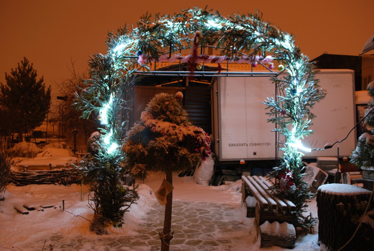 Арку, которую летом обвивает виноград, использую для поднятия новогоднего настроения. Сначала закрепляем гирлянду, можно использовать любую, я предпочитаю без мерцания, без разных режимов работы и однотонную, потому что её можно использовать для ландшафтного дизайна.