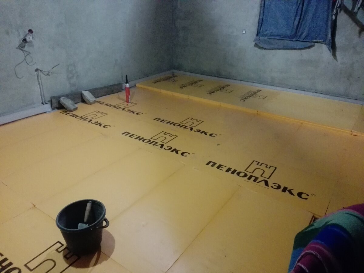 Все стыки проходим клей-пеной, на всякий случай. Замеряем толщину будущей стяжки: