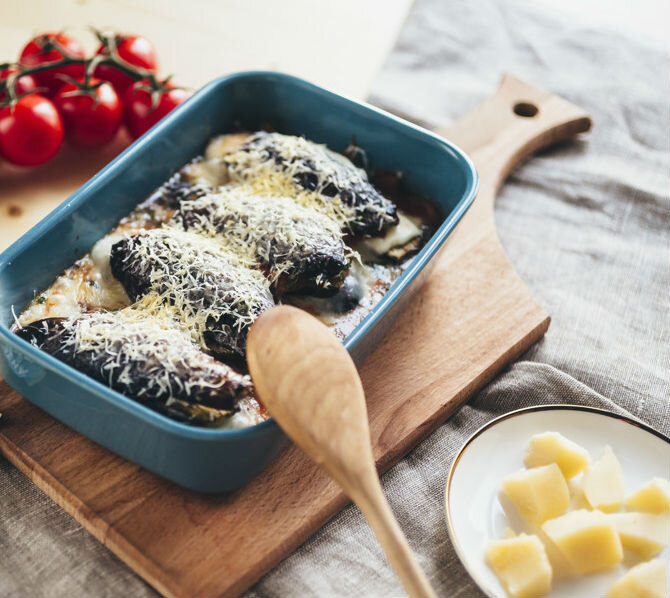 Посыпать измельченным базиликом, накрыть еще одним слоем ломтиков баклажана.