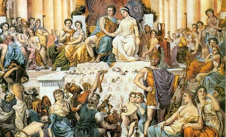 Церемония: в большинстве греческих городов-государств люди вступали в брак после наступления темноты. Церемония начиналась с нарядной невесты, идущей из своего дома в дом своего будущего мужа. Невеста стояла в медленно движущейся колеснице, тележке или каком-то колесном транспортном средстве. Ее семья и друзья шли за колесницей. Одни несли подарки, другие факелы, чтобы осветить путь, играли музыку, чтобы отпугнуть злых духов . Когда свадебный кортеж подходил к дому