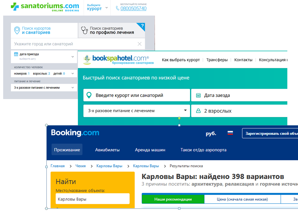 Booking долгое время фокусировался только на бронировании отелей. И по некоторым параметрам своего продукта проигрывал нишевым игрокам. Например, отсутствием видеороликов или информации о лечебных базах курортных отелей, которые он тоже продавал. Никто на сегодняшний день не может обогнать booking.com по географии охвата отелей. Но обойти его в узкой нише вполне возможно. Так в 2013 году сделал сервис онлайн бронирования санаториев bookspahotel.com. Он предлагал все те же отели на чешских курортах, что и букинг, но только с включенным лечебным пакетом. На тот момент booking.com этого не делал. Bookspahotel.com не сделал ничего супер уникального, просто сместил фокус. И сразу стал переманивать клиентов букинга. Работая над развитием bookspahotel.com автор этого материала не раз слышал от клиентов, что им удобнее ехать на курорт, уже имея заранее забронированный пакет с лечением. Следующим успешным нишевым продуктом на рынке европейских курортов стал sanatoriums.com. Над его созданием