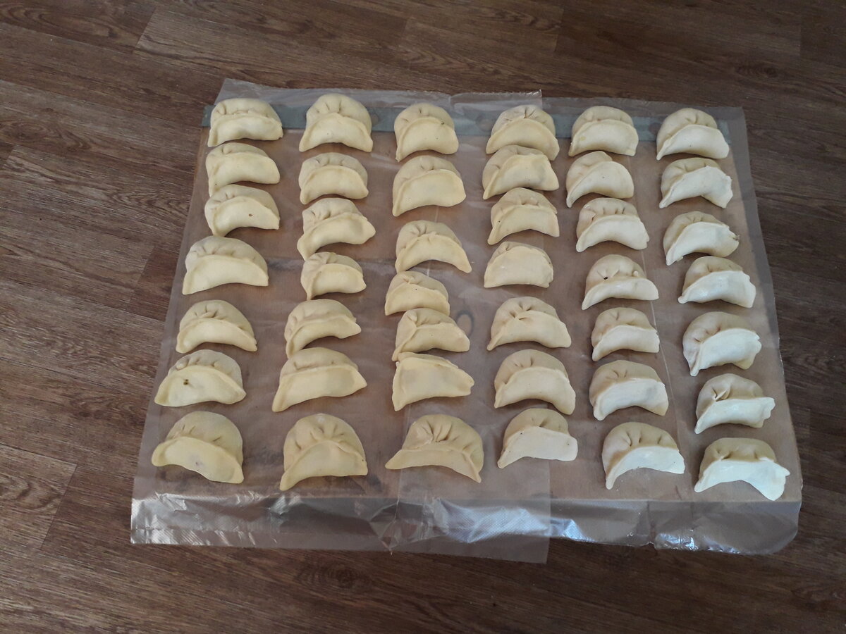 Тесто для вареников замешиваю на ледяной воде, добавив яйца и немного масла подсолнечного. Оно получается эластичным, хорошо лепится и не разваривается даже после заморозки. Заворачиваю в пакетик и помещаю в холодильник. Начинаю готовить начинку. Для этого необходимо: грибы, мясо, картофель, лук, специи. В этом году мы наготовили много груздей. Часть я посолила и часть отварила и заморозила. Затем я их размораживаю и жарю, добавляя лук. Картофель можно мелко резать кубиками, шинковать на крупной терке, перекручивать на мясорубке. В картофеле много воды и его необходим отжать и добавить перекрученное мясо ( я беру жирную свинину) с луком и грибами, дополнить специями. Готовый фарш я перекладываю в дуршлаг, что способствует удалению лишней жидкости. Начинаю лепить. Варю вареники 5 минут с момента закипания. Излишки замораживаю.