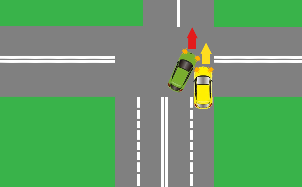 Два водителя попутно приближаются к перекрестку с двух полос. Однако если ранее они двигались по четырехполосной дороге, то после перекрестка эта дорога превратилась в двухполосную. Соответственно возникает вопрос: как разъехаться водителям зеленой и желтой машины, которые собираются проехать прямо?