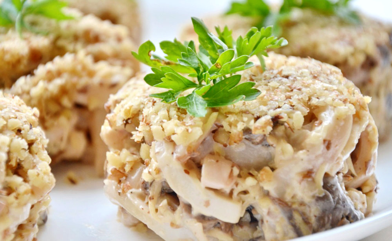 Салат с кальмарами, грибами и орехами на Новый год 2019
