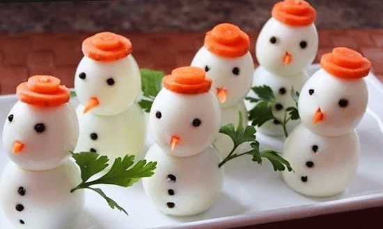 Уже придумали, какие закуски будут на вашем новогоднем столе? Если ещё нет, то рекомендую взять на заметку этот ооочень простой рецепт закусочных "снеговичков", они станут украшением праздничного стола. Приготовление: Закуска готовится из перепелиных яиц. На одного снеговика понадобится 2 яйца. Так что рассчитывайте сами, сколько яиц вам варить. Также понадобится вареная морковь. 2 яйца насаживаем на шпажку. Если она очень длинная, то свободный край просто отрезаем ножницами. Из вареной моркови делаем шляпку (два кружка разных размеров), носик. Из маслин делаем глаза, "пуговицы". Ещё можно из зеленого лука соорудить шарфик снеговикам, посыпать блюдо тёртым сыром, тертыми яичными белками - получится как будто снег. В общем проявляйте фантазию. Подобные снеговики можно наверняка сделать из куриных некрупных яиц. Но я, честно говоря, делала только из перепелиных. Приятного аппетита и с наступающим новым годом!