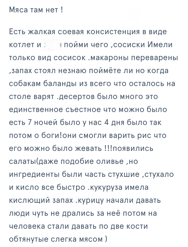 - Еда ужасного качества. Из мяса - только курица, и то далеко не каждый день. И за нее надо драться.