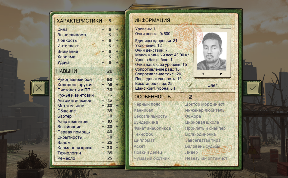 Самое главное в любой RPG-игре это система прокачки персонажа, так что могу сказать так: ATOM RPG в этом плане совершенен. Перед началом прохождения игроку будет доступен список ваших навыков, характеристик и особенностей героя, который позволяет настраивать персонажа под свой стиль игры.