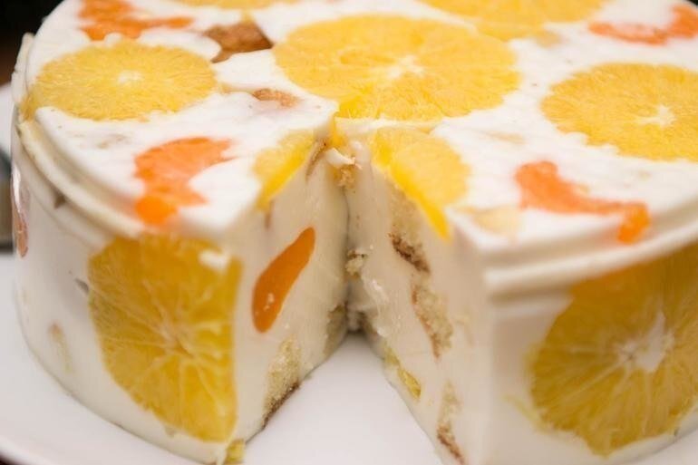 Предлагаю вам отличный праздничный цитрусовый десерт – желейный торт “Фруктовый Новый год”. Для бисквита: Для начинки: Для крема: Приготовление: Шаг 1: Желатин распустить в воде согласно инструкции. Через 40-60 минут подогреть, не кипятить, до полного растворения. Остудить. Шаг 2: Из яиц, сахара, соды и муки замесить тесто для простого бисквита. Выпекать бисквит при температуре 180 градусов в течение 15 минут. Остывший бисквит порезать на квадратики размером 1,5х1,5 см. Шаг 3: Апельсины и мандарины очистить от кожуры, мандарины разобрать на дольки, апельсины порезать кружочками. Ананасы и банан порезать кубиками. Шаг 4: Взбить сметану с сахаром, добавить ванилин и остывший желатин, хорошо перемешать, если желатина достаточно, то уже через 10 минут крем начнёт застывать. Шаг 5: Фрукты красиво выложить на дно формы с разъемными бортами. Выложить часть бисквита. Шаг 6: На бисквитные квадратики выложить фрукты. Залить кремом, затем выложить снова бисквит и фрукты залить кремом.
