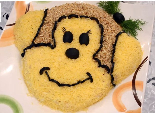 Новогодний салат “Обезьянка” – это оригинальный, праздничный салат с курицей, сыром, яйцом и орехами.