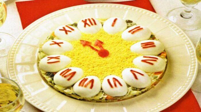 Предлагаю вам очень вкусный, оригинальный праздничный салат “Новогодние часы”. Состав: Приготовление: Шаг 1: Отварить филе курицы в кипящей подсоленной воде до готовности, остудить и мелко нарезать. Шаг 2: Чернослив залить горячей водой на 30 минут, слить жидкость и измельчить сухофрукты. Грецкие орехи порубить. Натереть сыр на мелкой терке. Шаг 3: Сварить яйца и морковь. Отделить яичные белки от желтков. Белки и желтки отдельно друг от друга натереть на мелкой терке. Шаг 4: Взять большую плоскую тарелку и выложить на нее слои новогоднего салата в следующей последовательности: 1 – слой: куриное филе, майонез.