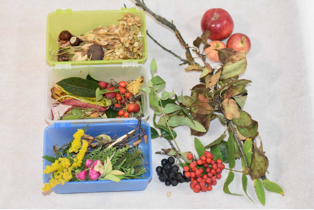 Всё, что можно помыть — каштаны, камешки, палочки — помыли и просушили. Плоды и листья сложили в коробочку на солнышко. Немного листьев, положили в книжку между страницами, они пригодятся для других поделок. Семена насыпали в прозрачные баночки, так легче ориентироваться. Веточки деревьев, траву, соцветия — в контейнер. Стол я застилаю, чтобы не переживать за брызги клея и краски.
