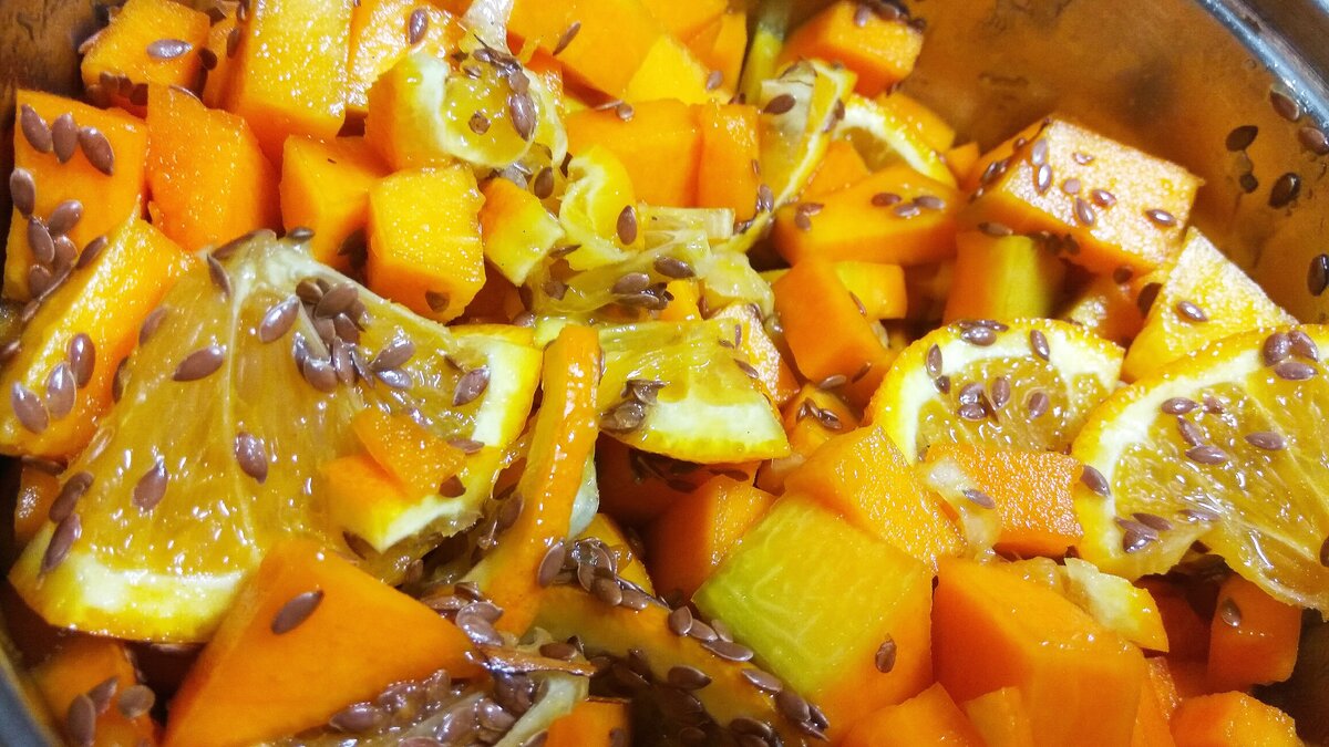 Пряный, в меру сладкий и ароматный десерт понравится всем. Я никогда не любила кабачки и тыкву. Но их очень любит моя мать. И в промышленных масштабах выращивает на огороде. Поэтому до весны вся семья буквально давится этими овощами: они везде! Когда я стала жить отдельно, меня постоянно снабжали этими продуктами, хотя и сказано было: не надо. Поэтому пришлось изворачиваться и искать рецепты, которые даже мне придутся по душе. И вот один из любимых. Нам понадобится: Готовим. 1) Тыкву измельчаем, я режу кубиками примерно два на два сантиметра или чуть крупнее. Апельсин прямо с коркой нарезаем четверть-кольцами. Все это смешиваем с медом, корицей и семенами льна. 2) Готовим матрасик из теста. Муку смешиваем с сахаром - несколько столовых ложек, по вкусу. Добавляем туда яйцо и растопленное мало или маргарин. Кстати, как-то раз у меня его не оказалось под рукой и сливочное масло тоже закончилось. Заменила рафинированным подсолнечным и тоже вышло вполне себе. Тесто распределяем по форме до