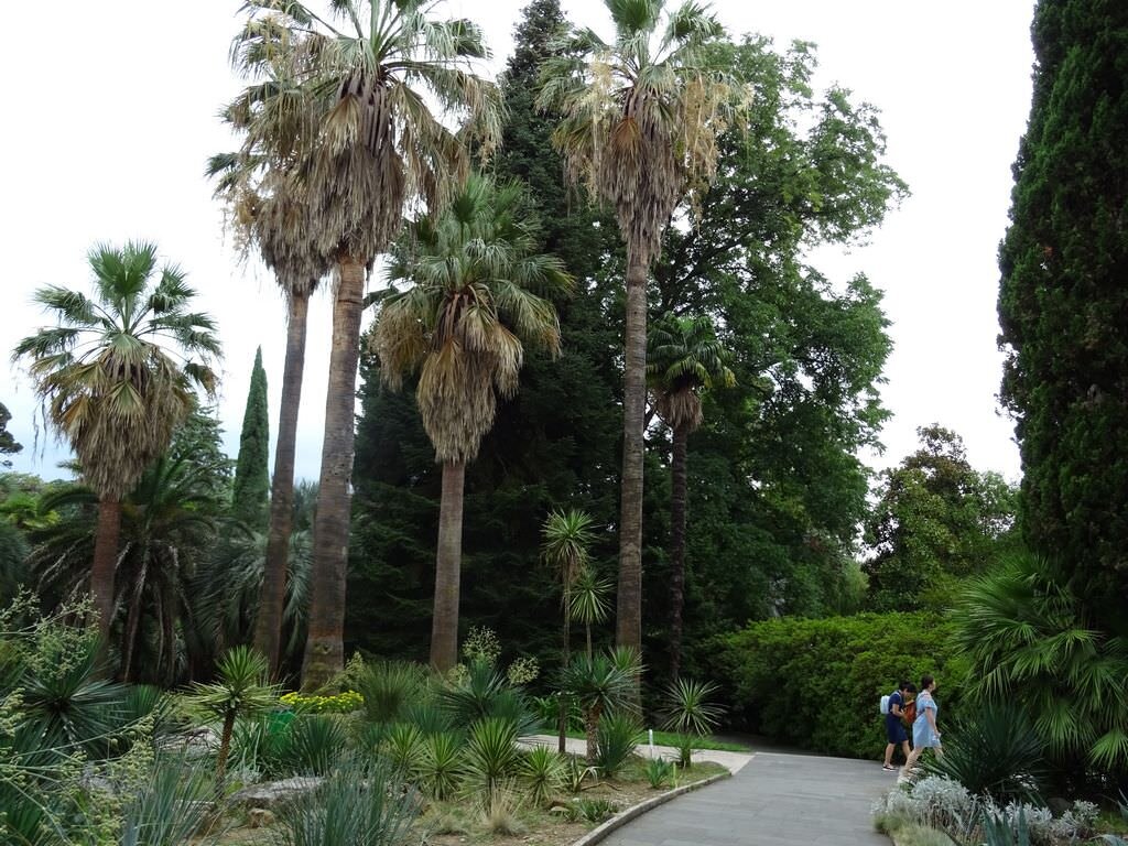 В дендропарке произрастают более двух тысяч сосен (почти 80 видов), но есть, конечно, и лиственницы, дубы, величественные красавцы платаны, или как их ещё называют земляничные деревья, и вот такие высоченные пальмы.