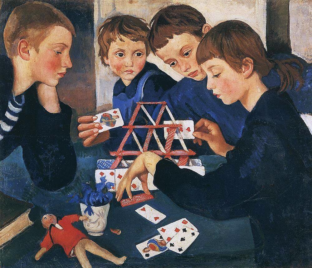 Карточный домик, давший название картине - лёгкая непрочная постройка. Тут символично все: дети в одежде синего цвета, сидят, прижавшись друг к другу, у покрытого тёмной скатертью стола и строят из игральных карт хрупкий домик. Они сосредоточены, одновременно ожидают и боятся крушения постройки. В этой картине все чувства художницы: непонимание, что будет дальше, беспокойство, тоску по мужу.