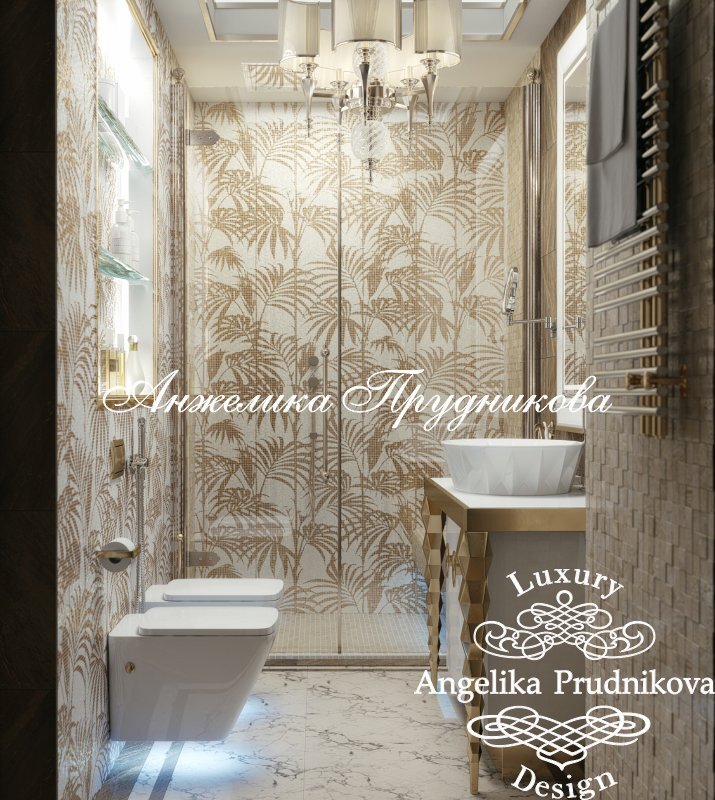 Мраморный пол, декоративные панно с изображением пальмовых листьев, мозаика с 3D-эффектом – дизайн санузла в светлых тонах в КП «Горки-2» полон сюрпризов. Эргономичное планировочное решение позволило разместить на небольшой площади все необходимое, включая душевой уголок. А золотистые оттенки в облицовке и аксессуарах сделали обстановку праздничной.