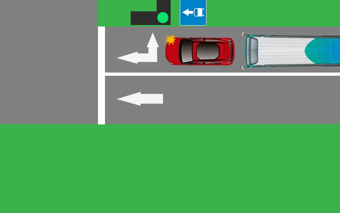 Водитель красной машины решил добраться по своим делам до магазина, он подъезжает к перекрестку, ему нужно повернуть направо. Для того чтобы совершить маневр, он заблаговременно перестроился на крайнюю правую полосу, которая используется в качестве выделенки для автобусов. Пока водитель легковушки стоял на светофоре, сзади подъехал автобус, он собирается ехать прямо. Он начинает сигналить, мол пропусти, однако стрелка на светофоре не горит. Что делать легковушке в данной ситуации?