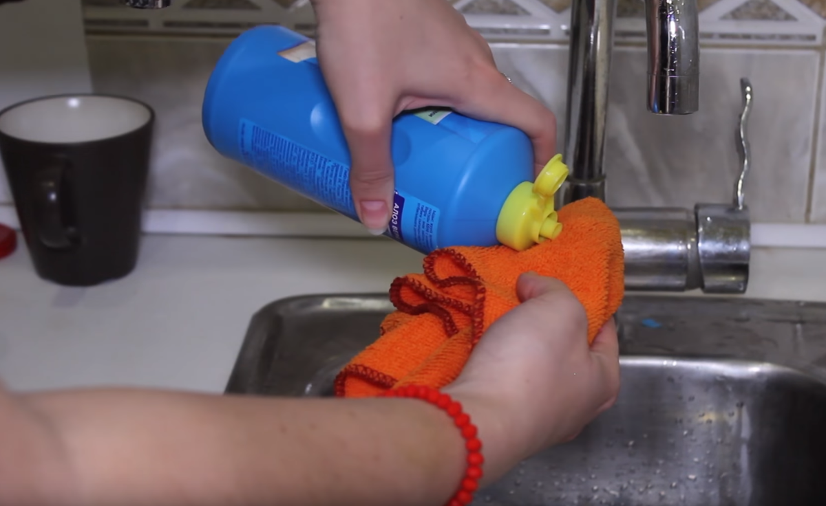 Для чистки наиболее загрязненных частей потолка следует использовать моющие средства, пользоваться можно любым на мыльной основе. Главное, чтобы в его составе не было ацетона и абразивных добавок. Пятна от жира удобней всего смывать мягкой губкой или салфеткой из микрофибры смоченной средством для мытья посуды, после этого необходимо вымыть потолок чистой водой и протереть его насухо. Если после применения мыльного раствора на основе моющего средства не удалось избавится от застарелых пятен, попробуйте оставить состав на 2-3 минуты на загрязненной части, после необходимо протереть это место влажной губкой, затем сухой мягкой тканью. Для глянцевых натяжных потолков больше всего подходит средство для мытья окон. Аккуратно нанесите его на полотно, а затем протрите его сухой тканью, что бы на нем не остались разводы. Важно! Не используйте для мойки натяжных потолков жесткие щетки и губки, поскольку полотно очень нежное и любые механические повреждения сильно заметны на поверхности. Как убр