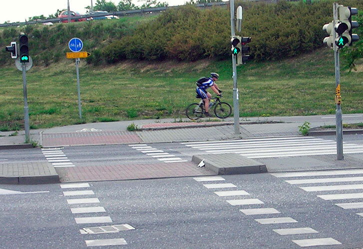 Когда пересечение дороги по велодорожке и пешеходному переходу совмещено, то возможно использование только одного типа светофора – велопешеходного. В этом случае его сигналы распространяются как на пешеходов, так и на велосипедистов.