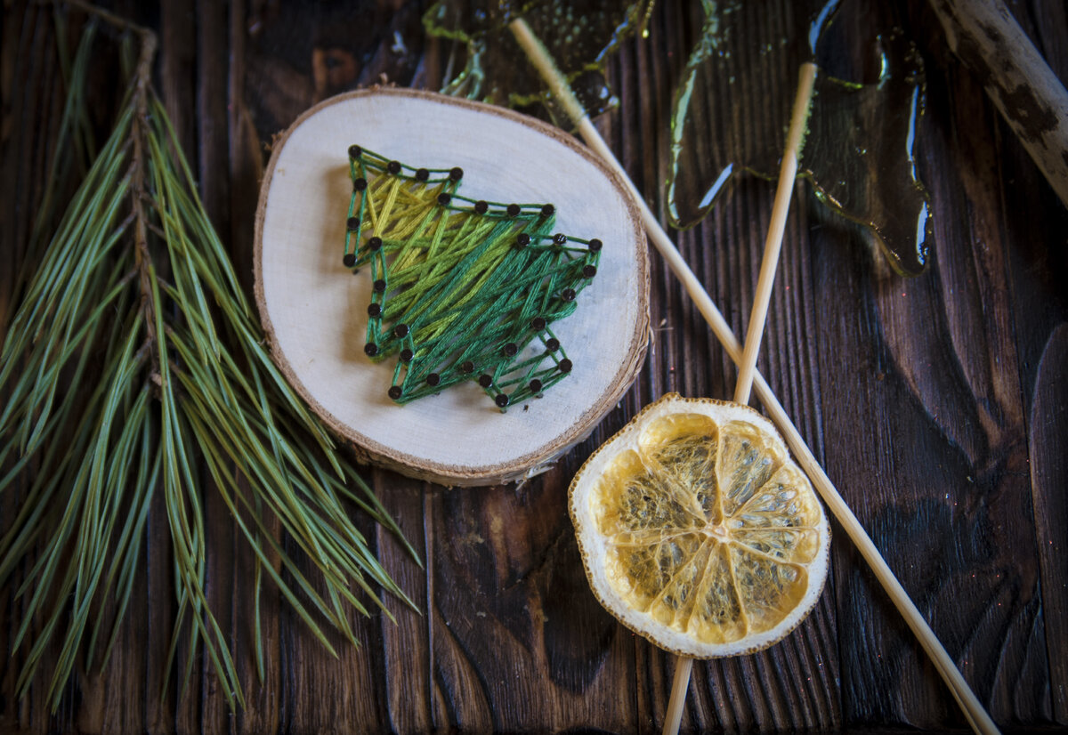 Нитки решили наматывать в три цвета: от светлого к темному. На елочке особенно хорошо получилось сделать градиент.