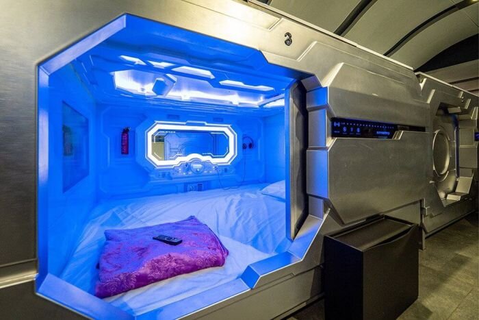Ожидание рейсов в петербургском аэропорту станет более комфортным. В пассажирском терминале начал свою работу капсульный отель «Aerosleep». Всего установлено тринадцать индивидуальных капсул. Они выполнены в футуристическом стиле и чем-то напоминают каюты космических кораблей из фантастических фильмов. Внутри капсулы размещается полноценное спальное место размером 160 на 200 сантиметров. Постояльца получают подушки, одеяла, разовое постельное белье. Из дополнительных удобств в каждом «номере» есть журнальный столик, сейф для хранения ценностей, зеркало, USB -разъем, розетка 220В и часы будильник. Также работает бесплатный беспроводной интернет, есть развлекательная система. Особенностью капсулы является настраиваемая светодиодная подсветка. Благодаря ей каждый гость сможет создать идеальные условия для сна или чтения. Специальная система вентиляции гарантирует наличие в капсуле свежего воздуха. Малогабаритный багаж постояльцы могут взять с собой в капсулу, все остальное