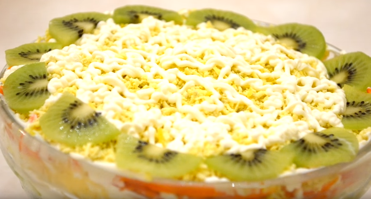 Дорогие мои, сегодня спешу поделиться с вами рецептом салата, который бесспорно полюбится вам вашим гостям. Нашла я его на просторах интернета, но приготовив для близких, определилась, что буду готовить к Новому году. Сытный, ароматный, с пикантным кисло сладким вкусом, для тех, кто предпочитает не только вкусно, но еще и красиво! Ставьте лайки, делитесь нами в социальных сетях, подписывайтесь на канал! Ингредиенты 400-500 гр. куриного филе 3 киви 1 яблоко (кисло сладких сортов) 150 гр. твердого сыра 3 яйца 100 гр. корейской моркови Майонез Соль и черный молотый перец по вкусу Приготовление Филе отварим и нарежем соломкой, рассыплем на дно блюда, польем майонезом. Нарежем киви тоненькими ломтиками и разместим на филе. Следующим слоем идут натертые на треке отварные белки и снова майонез. Затем очищенное от кожицы яблоко, натертое на терке и майонез. Если морковь длинная, немного измельчим, разместим в салатнике, польем майонезом. Далее натертые на мелкой терке желтки, снова