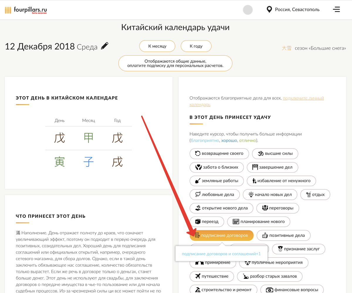 Бывает у вас такое, что вы планируете одно, рисуете в уме красивую картинку, как хорошо у вас все получится, а в результате все идет совсем не так, как вы хотели? Вы планируете отправиться на романтическое свидание, а оно заканчивается обидами и разочарованием? Или планируете переговоры, чтобы совершить хорошую сделку, а второй их участник никак не соглашается на ваши условия? А ведь можно просто подобрать хороший день и его энергии помогут вам добиваться большего с меньшим вложением усилий. И это не теория, а долгая практика практичных китайцев! Уже много веков они используют Тун-шу, китайский календарь удачных дней. Этот альманах издается ежегодно миллионными тиражами и пользуется необыкновенным успехом. В этой книге по сложным формулам рассчитано и расписано, чем стоит и чем не стоит заниматься каждый день года. Планируешь какое-то дело, заглядываешь в такой календарь хороших дней на 2018 год и успех тебе почти гарантирован! Проблема в том, что китайские календари удачных дней, как