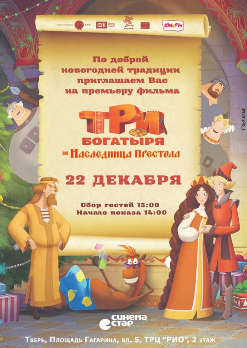 «Три богатыря и наследница престола» в кинотеатре «Синема Стар» 22 декабря! Вместе с героями любимого мультфильма играем, веселимся, фотографируемся и выигрываем классные призы и подарки! Путешествие в сказку начнется в 13:00. Газета «Караван+Я» выходит на территории Тверской и Московской областей с приложением «Ярмарка объявлений». Работа, недвижимость, строительство, образование, туризм, бизнес – все, что вам необходимо знать, вы найдете у нас! Принимаются бесплатные объявления по телефону: 8(4822)788-139. Нужен больший эффект? Для Вас реклама и платные объявления! Тел.: 8(4822)788-798. Подробнее с правилами можно ознакомиться по ссылке.