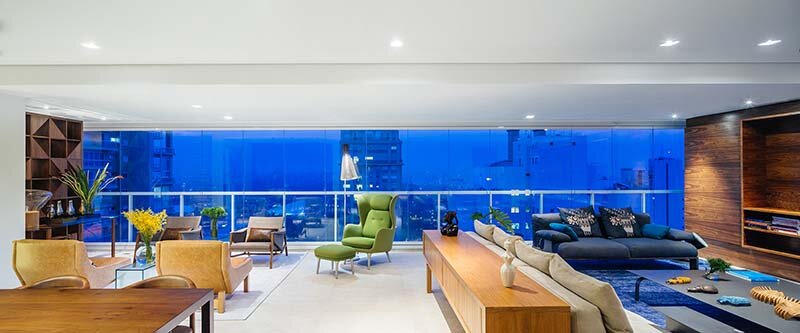 Ibirapuera – апартаменты площадью 462 кв. м, расположенные в одном из домов Сан-Паулу, Бразилия. Заказчики поставили перед дизайнерами FCstudio две главные задачи: 1. Потенциализировать открывающийся вид на близлежащий городской парк, спроектированный архитектором Оскаром Нимейером. 2. Эффективно интегрировать функциональные зоны апартаментов. С первой задачей дизайнеры справились легко, сделав практически периметральные панорамные окна во всю высоту. Такой приём не только открыл вид на парк Нимейера, но и впустил в интерьеры большое количество света, при этом визуально объединив зоны апартаментов. Вторая задача была решена несколькими способами. Во-первых, дизайнеры уделили внимание размерам и функциональной программе каждой области. Клиенты любят принимать много гостей, поэтому общественные пространства должны преобладать и отличаться разнообразием. Общую социальную область можно условно разделить на гостиную, тв-зону, столовую, террасу. ТВ-зону формирует углублённый стеллаж с гор